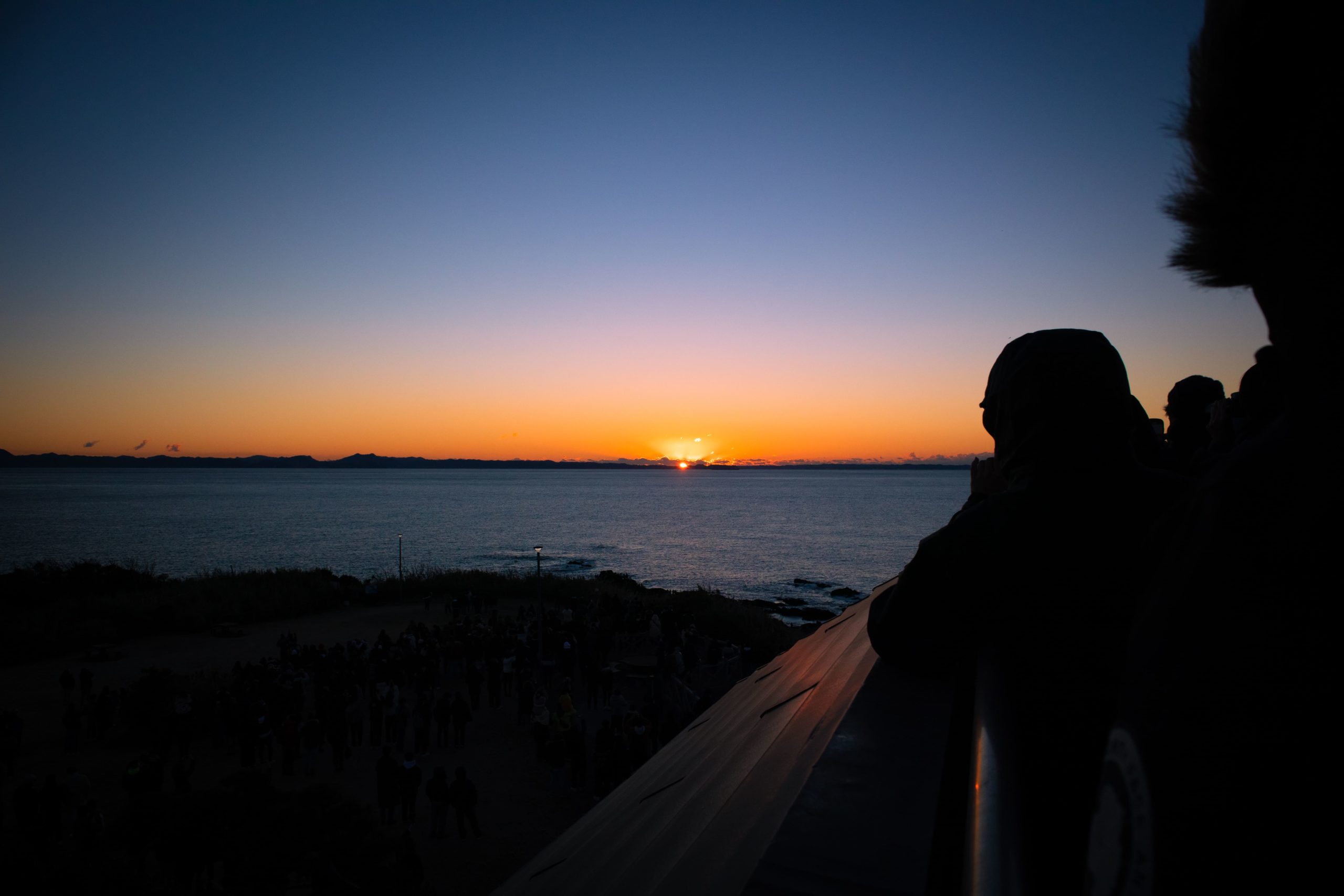 今回私たちは、城ヶ島公園内にある第一展望台で見ることにしました。城ヶ島の東端に位置し、高さもあるため、さえぎるものなく初日の出を見ることができます。展望台の下には広場があります。日の出が近づくにつれ混雑していました。そのため、いい位置で見たり写真を撮ったりするためには、少なくとも30分程前に場所取りに向かうことをお勧めします。