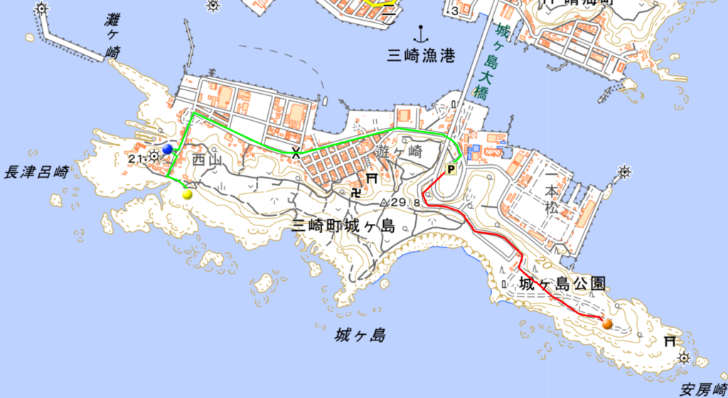(下の地図 赤:初日の出 緑:夜景 P:城ヶ島第二駐車場)