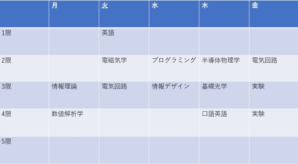 私は、工学部に入っており、このような時間割となっています。一年生の時の時間割はほぼ必修で、一限からの日が多かったのですが、今回はなんと火曜日だけという構成になっております。